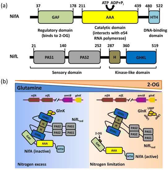 Figure 2. The domain structures and functions of NifA and NifL. (a) Schemes of the domain structures of the NifA and NifL protein; (b) The distinct regulatory modes of NifA–NifL–GlnK complex in the excess or limitation of nitrogen. In nitrogen excess, GHKL domain of NifL protein interacts with NifA protein to inhibit NifA. Glnk can interact with NifL, enhancing the inhibition of NifA activity by NifL. When nitrogen is limited, the uridylylation of Glnk disrupts the interaction between Glnk and NifL. 2–OG can bind to GAF domain of NifA to remove the inhibition of NifA activity by NifL.