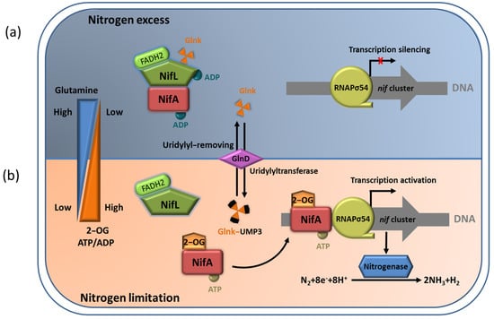 Figure 4. The NifL–NifA system’s responses to environmental and metabolic conditions in A. vinelandii. (a) In nitrogen–excess conditions, the binding of high concentration of glutamine to GlnD results in uridylyl removal from Glnk. NifL forms the binary complexes with NifA to inhibit NifA activation. In addition, the non–covalently modified GlnK can also interact with NifL to promote the formation of the GlnK–NifL–NifA ternary complex and inhibit NifA activity, leading to the transcriptional silencing of nif cluster; (b) In nitrogen–limiting conditions, high concentration of 2–OG can result in the association of NifL and GlnK in the NifA–NifL–Glnk complex. Free NifA can activate the transcription of nitrogenase gene.