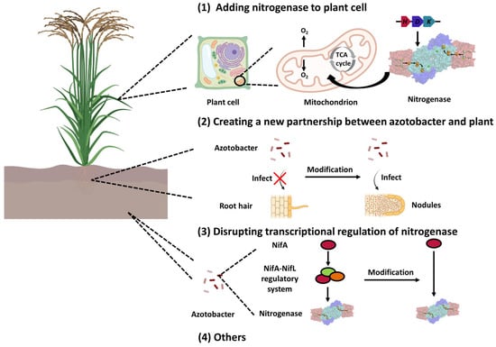Figure 5. The strategy of engineering nitrogen fixation. (1) Adding nitrogenase into plant cells. Nitrogenase requires a lot of energy and a low–oxygen environment to execute the nitrogen–fixing function. The mitochondrion provides a suitable place to accommodate the enzyme. (2) Creating a novel partnership between azotobacter and plants. Under natural conditions, non–symbiotic azotobacter are not capable of infecting crops. Several key modifications, such as expressing rhizopine in the crop cells and the receptor of rhizopine in azotobacter, can specifically allow crops to recognize azotobacter. The elongated root hair can create a tunnel for azotobacter to infect the root hair and form nodules. (3) Disrupting the transcriptional regulation of nitrogenase. As the transcriptional regulation of nitrogenase is the crucial rate–limiting step in nitrogen fixation, several modifications can disrupt the original regulatory pathways, allowing them to evolve in ways beneficial to agricultural development. (4) Other strategies.