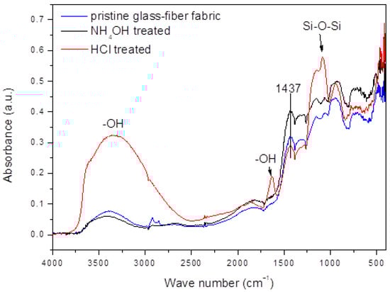 FTIR spectra of the pristine, NH4OH-treated, and HCl-treated woven glass-fiber fabric are compared in Figure 1.