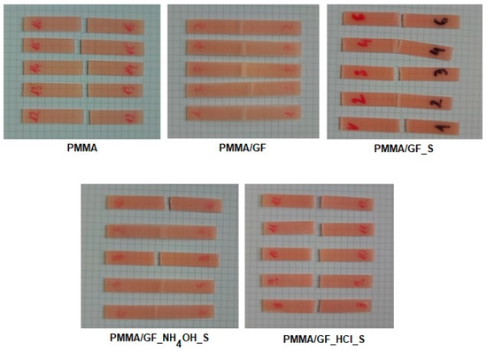 As shown in Figure 2, all the PMMA specimens had fractured into two pieces showing a rectilinear and smooth fracture surface. Visual inspection of PMMA/GF specimens indicated that only one layer of the matrix was broken, while the second matrix layer and the glass fiber layer were preserved. In the vicinity of the rupture, the broken matrix layer was partially separated from the fiber layer. Three of the five PMMA/GF_S composite specimens had fractured into two pieces, and in the other two (marked as 2 and 4), two parts of specimens are held together by some unbroken glass fibers. In two of the five specimens of the PMMA/GF__NH4OH_S group, there was a complete fracture of the composite, and in the other three there was a fracture of only one layer of the matrix, as seen in the PMMA/GF group. All composite specimens of PMMA_/GF_HCl had fractured into two pieces.