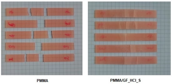 During the impact testing, the PMMA specimens had fractured into two or three pieces. The PMMA/GF_HCl_S photo illustrates the composite specimens’ typical appearance after impact testing. In all composite specimens, only one matrix layer had fractured, at one or more places, while the second matrix layer and the glass fiber layer were preserved. In the vicinity of the ruptures, the broken matrix layer was partially separated from the fiber layer.