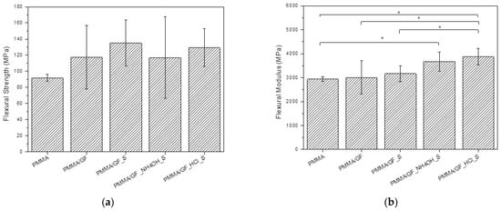The mean flexural modulus values of reinforced specimens PMMA/GF and PMMA/GF_S were higher, but not significantly, when compared to the unreinforced PMMA matrix. The highest values of flexural modulus are shown in the PMMA/GF_ HCl _S group (3.87 ± 0.34 GPa), which are significantly higher when compared to the unreinforced PMMA matrix, and composite specimens PMMA/GF and PMMA/GF_S, but not significantly different compared to the PMMA/GF_ NH4OH _S group (3.67 ± 0.40 GPa). Further, there were statistically significant differences in the flexural modulus of the control PMMA specimens and PMMA/GF_ NH4OH _S specimens.