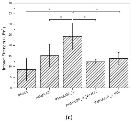 Mechanical properties of the test specimens: (a) Flexural strength; (b) Flexural modulus; (c) Impact strength. The significant difference between two groups is denoted by asterisk (*) with p < 0.05.