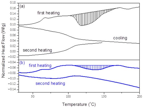 Figure 5 shows dynamic DSC curves obtained for unreinforced acrylic systems (PMMAs), that were previously cured at room temperature (Figure 5a) or 55 °C (Figure 5b) for 2 h. The samples were heated to around 250 °C, then cooled down to room temperature and immediately reheated to 150 or 200 °C.