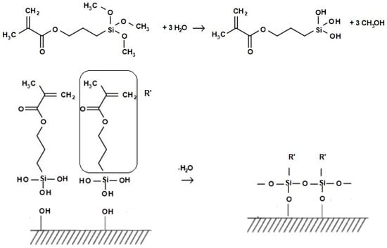 Possible trialkoxysilane surface modification reactions are illustrated in Figure 6. During the treatment of glass fibers with the 3-(trimethoxysilyl) propyl methacrylate (3-TMSPMA), the methoxy groups can hydrolyze in an aqueous environment, producing silanol groups and liberating methanol. Silanol groups may self-condense, forming polymeric siloxane structures, and/or condense with hydroxyl groups present on the surface of glass fibers to form a covalent bond to the substrate. On the other side, the methacryloyl group of the silane coupling agent radically polymerizes with double bonds in the matrix resin and chemically binds fibers with the matrix resin.
