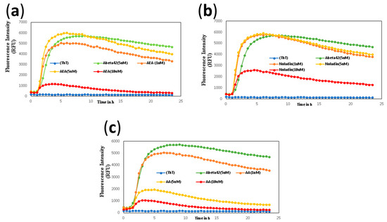 ThT-monitored 24 h aggregation kinetics of Aβ42 (5 μM) in the presence of 1, 5, 10 μM of AEA (a) Noladin (b), and AA (c). Aggregation kinetics were monitored by ThT-fluorescence spectroscopy (excitation = 440 nm, emission = 490 nm) at pH 7.4, 37 °C in phosphate buffer. Results are the average ± SD of three replicates.