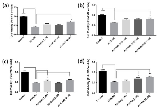 To assess the effects of Aβ42 (5 µM) alone or Aβ42 mixed with each endocannabinoid (1, 5, 10 µM) and Aβ42 with endocannabinoids (mentioned concentrations) mixed with AM251 (5 µM) on cell viability, a one-way ANOVA with Dunnett’s multiple comparisons test was performed to establish statistical significance between compound groups and vehicle-treated control (α = 0.05). The results are shown as the average ± standard error of the mean (SEM). The data is representative of quadruplicates samples for n = 4 independent experiments.