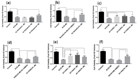 Noladin did increase cell viability significantly (p < 0.05 *) in CB1-CHO cells at the highest concentration (Figure 3a), and AM251, as a CB1 antagonist, blocked this protective effect (p < 0.05 *, Figure 3b). OAE, at all the concentrations tested (1, 5, 10 μM), also increased the cell viability significantly in CHO cells (p < 0.05 *), and AM251 reversed this effect as well (p < 0.05 *, Figure 3c,d). Similarly, AA at all tested concentrations (1, 5, 10 µM) was able to increase the cell viability of CHO cells treated with Aβ42 (5 µM), and AM251 was able to reverse this protection (Figure 3e,f).