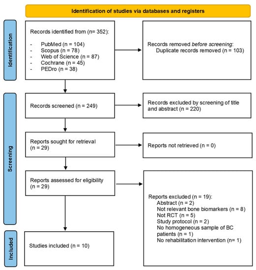 Through our search strategy, 352 records were identified from the five databases. After duplication removal, 249 studies were assessed for eligibility and screened for title and abstract. Therefore, 220 records were excluded, and 29 full-text records were assessed for eligibility. Nineteen records were excluded for inconsistency with the eligibility criteria (two were only abstracts, eight studies did not assess relevant bone biomarkers, five studies were not RCT, two studies were RCT protocols, one study did not assess a homogeneous sample of BC patients, and one study did not assess rehabilitation intervention). The studies assessed in full text and the reasons for exclusions are presented in detail in Supplementary Table S1. Lastly, 10 studies were included in the present work [,,,,,,,,,]. Figure 1 shows the PRISMA 2020 flow diagram of the search process in detail.