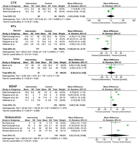 Meta-analysis of the studies included [,,,,,,,,]. Abbreviations BSAP: bone specific alkaline phosphatase; CI: confidence interval; CTX: C-telopeptides of type I collagen; NTX: crosslinked N-telopeptides of type I collagen; SD: standard deviation.