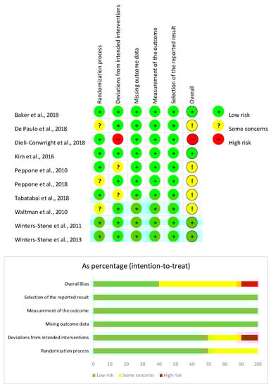The risk of bias was assessed by RoBv.2, reporting 4 studies [,,,] (40%) with a low overall risk of bias. Two studies (20%) [] showed some concerns in the second domain for deviations from intended interventions due to the missing appropriate analysis for effect of assignment to intervention. These concerns lead to an overall medium risk of bias. Lastly, 1 study [] (10%) showed a high risk of bias for exclusion of five women from analysis after the intervention, resulting in a high overall risk of bias (see Figure 4).