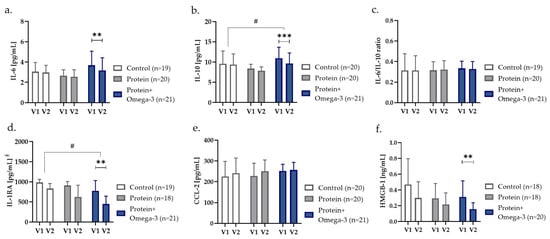 Fasting serum concentrations of (a) IL-6, (b) IL-10, (c) IL-6/IL-10 ratio, (d) IL-1RA, (e) CCL-2, and (f) HMGB-1 presented as estimated mean with 95% confidence interval before (V1) and after (V2) eight weeks of control, high-protein (protein) or high-protein, omega-3-enriched (protein + omega-3) diet. ** p < 0.01, *** p < 0.001 obtained from within-group comparisons with either paired t-test or Wilcoxon rank test, and # p < 0.05 indicating group × time-interaction effects between groups in generalized linear mixed models with random effects on subjects, adjusted for age, sex, and fat mass index, § and due to significantly different cases at baseline, also adjusted for baseline values. CCL-2 c-c motif chemokine ligand-2; HMGB-1 high-mobility group box-1; IL interleukin, RA receptor antagonist.