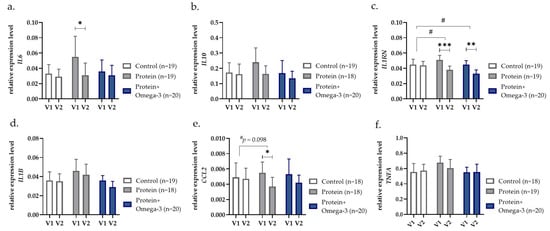 Gene expression levels analyzed in peripheral blood mononuclear cells of (a) IL6, (b) IL10, (c) IL1RN, (d) IL1B, (e) CCL2, and (f) TNFA presented as estimated mean with 95% confidence interval before (V1) and after (V2) eight weeks of control, high-protein (protein) or high-protein, omega-3-enriched (protein + omega-3) diet. * p < 0.05, ** p < 0.01, *** p < 0.001 obtained from within-group comparisons with either paired t-test or Wilcoxon rank test, and # p < 0.05 indicating group × time-interaction effects between groups in generalized linear mixed models with random effects on subjects, adjusted for age, sex, and fat mass index. CCL2 c-c motif chemokine ligand-2; IL interleukin, B beta, RN receptor antagonist; TNFA tumor necrosis factor-α.
