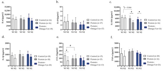 Ex vivo whole-blood LPS-induced concentrations of (a) IL-6, (b) IL-10, (c) IL-1RA, (d) IL-1β, (e) CCL-2, and (f) TNF-α presented as estimated mean with 95% confidence interval before (V1) and after (V2) eight weeks of control, high-protein (protein) or high-protein, omega-3-enriched (protein + omega-3) diet. * p < 0.05 obtained from within-group comparisons with either paired t-test or Wilcoxon rank test, and # p < 0.05 indicating group × time-interaction effects between groups in generalized linear mixed models with random effects on subjects, adjusted for age, sex, and fat mass index. CCL-2 c-c motif chemokine ligand-2; IL interleukin, RA receptor antagonist; TNF-α tumor necrosis factor-α.
