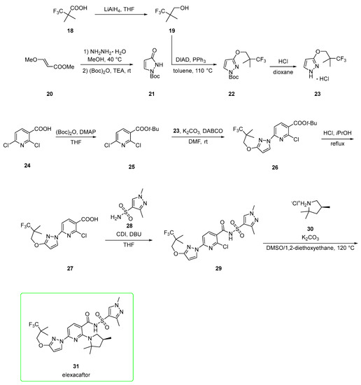 Elexacaftor has been described as both a corrector and potentiator of CFTR [36]. A first synthetic pathway (Scheme 4) was elaborated by Vertex [31,34,36]. It developed from the reduction of 3,3,3-trifluoro-2,2-dimethylpropanoic acid 18 to alcohol 19, which is used in the Mitsunobu condensation of pyrazolone 21, which is prepared from met€ (E)-3-methoxyacrylate 20 upon the addition of hydrazine hydrate and subsequent BOC protection. Mitsunobu product 22 was subjected to BOC deprotection with HCl to afford hydrochloric salt 23.
