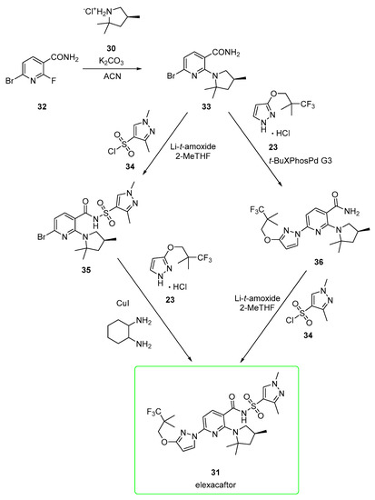 SNAr reaction of 32 with pyrrolidine 30 in acetonitrile and K2CO3 afforded amide 33, which was made nucleophilic by treatment with lithium tert-amoxide in 2-MeTHF as a solvent and treated with sulfonyl chloride 34 to yield acyl sulfonamide 35. The eventual copper-catalyzed reaction between 35 and 23 afforded elexacaftor 31. Alternatively, synthon 33 was first converted into pyrazole derivate 36 in a Buchwald–Hartwig amination employing third generation palladacycle catalyst (tBuXPhos Pd G3). Derivate 36 was lastly converted into elexacaftor 31 via the same conditions (lithium tert-amoxide in 2-MeTHF as a solvent, treated with sulfonyl chloride 34) used to synthesize intermediate 35.