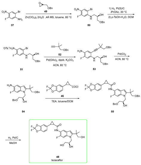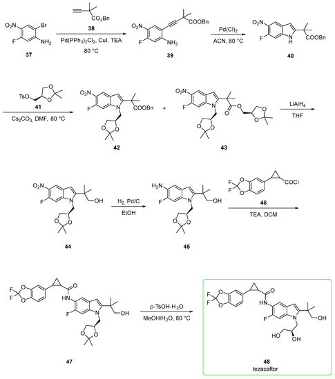 Its synthesis (Scheme 6) [33,40,41] starts from 2-bromo-5-fluoro-4-nitroaniline 37. Sonogashira coupling [Bis(triphenylphosphine)palladium(II) dichloride] between 37 and alkyne 38 gave disubstituted alkyne 39, which was subjected to cyclization under Pd(Cl)2 conditions to afford indole 40. The indolic NH was alkylated with tosylate 41 in the presence of cesium carbonate to yield 42 and the undesired 43 (the transesterification product). Compound 42 was treated with LiAlH4 to yield the corresponding primary alcohol 44. This underwent nitro reduction to yield indolamine 45. Then, the nucleophilic attack of 45 to acyl chloride 46 in the presence of triethylamine afforded 47. In the last step, the removal of the acetal protecting group afforded tezacaftor 48 in a moderate yield (47%) after chromatography.