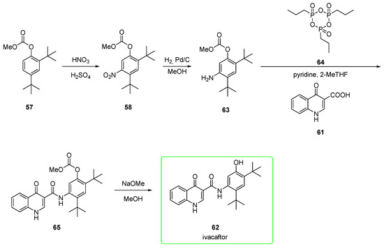 An alternative pathway (Scheme 9) [46] encompasses similar steps but in a different order. In particular, the hydrolysis of the carbonate was carried out as the final step. Nitro compound 58 was reduced to aniline 63. This was condensed with quinoline 61 upon activation of the carboxylic acid with propanephosphonic acid anhydride 64 to yield precursor 65. This was eventually transformed after alkaline hydrolysis into ivacaftor 62. No yields were provided for these reported steps. The protection of the phenol as the electron-withdrawing carbonate is likely to minimize its ortho/para-directing effect, as seen in the previous synthesis.