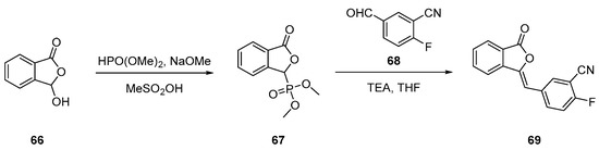 Compound 69 is obtained by first reacting benzofuran 66 with dimethyl phosphonate to yield derivative 67. This was used in the subsequent Horner–Wadsworth–Emmons (HWE) reaction with aldehyde 68 to yield alkene 69.