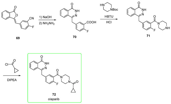 In the first strategy (Scheme 11) [52], nitrile 69 is converted into the corresponding carboxylic acid by alkaline hydrolysis, and the phthalazine-one is formed upon the addition of hydrazine (compound 70). This is subjected to condensation mediated by (2-(1H-benzotriazol-1-yl)-1,1,3,3-tetramethyluronium hexafluorophosphate (HBTU) followed by removal of the BOC group upon addition of HCl to provide the piperazine-containing amide 71. This was eventually treated with cyclopropanecarbonyl chloride and DIPEA as a base to afford olaparib (72).