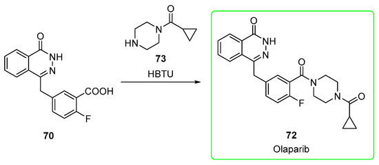 Olaparib (72, brand name Lynparza®) was approved by the FDA for the first-line maintenance treatment of breast cancer susceptibility gene (BRCA)-mutated (BRCAm) advanced ovarian cancer [47]. Olaparib belongs to the N-acyl piperazines class of compounds. The action of olaparib relies on the poly(ADP-ribose) polymerase PARP inhibition [48]. Poly(ADP-ribose) polymerases (PARPs) are a family of enzymes that catalyze the addition of poly(ADP-ribose) subunits onto themselves and other acceptor proteins and are involved in DNA repair [49]. The IC50 value towards PARP of olaparib is 6 nM [50]