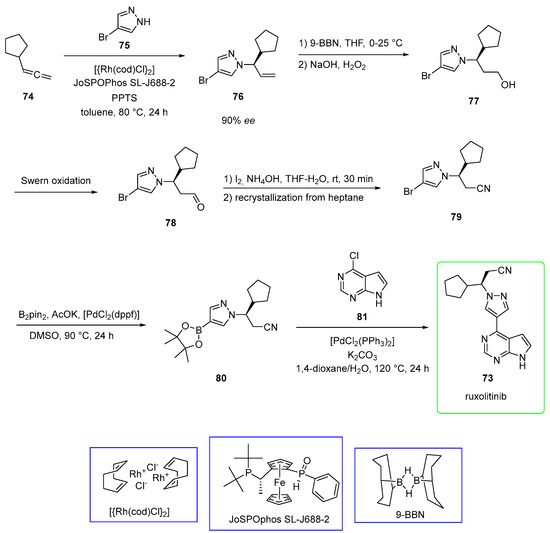 Haydl and co-workers, as an example, used a rhodium-catalyzed regioselective synthesis of pyrazole, which is the crucial synthon for the preparation of ruxolitinib (Scheme 14) [58]. Pyrazole 75 was added to terminal allene 74 to yield enantioenriched allylic pyrazole 76 (90% ee). The reaction was catalyzed by rhodium with ligand JoSPOPhos. The additional presence of pyridinium p-toluenesulfonate (PPTS, 0.2 equiv) played a significant role in obtaining the desired N1 product selectively. The subsequent hydroboration (9-borabicyclo[3.3.1]nonane or 9-BBN) followed by oxidation (H2O2) provided the primary alcohol 77. Swern oxidation of 77 afforded aldehyde 78, in turn, converted into nitrile 79 by the addition of ammonium hydroxide and iodine and purification by recrystallization from heptane. The installation of boron in the place of the bromide group was mediated by bis(pinacolato)diboron (B2pin2) and [1,1′-Bis(diphenylphosphino)ferrocene]palladium(II) dichloride ([PdCl2(dppf)] to yield boronic ester 80. Eventually, Suzuki coupling [catalyzed by bis(triphenylphosphine)palladium chloride] of 80 with chloro-azapurine 81 provided ruxolitinib (73). The yield of the final product (over two steps) was 81%.