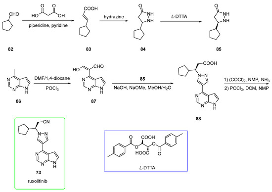 Despite the elegant strategy, the reactions performed to synthesize the pyrazole moiety required high amounts of expensive and complex chiral catalysts [59]. Therefore, a more recent patent (see Scheme 15) [60] overcame these issues and made the process more scalable. The selected starting material was cyclopentanecarbaldehyde 82, which was converted to €-alkene 83 in a Knoevenagel reaction involving malonic acid and piperidine/pyridine as a base. This was treated with hydrazine to afford cyclopentyl-pyrazolidinone 84, which was resolved with di-p-toluoyl-L-tartaric acid (L-DTTA) to yield pure enantiomer 85. On the other hand, the 6-methyl-7-deazapurine derivative 86 was treated with Vilsmeier reagent to yield aldehyde 87. This was used with 85 in the presence of alkaline media to yield carboxylic acid precursor 88 of ruxolitinib. This was first treated with oxalyl chloride and ammonia to form the primary amide and later dehydrated to a nitrile upon using POCl3 to yield ruxolitinib. This route allowed the obtainment of 73 in a good yield, avoiding the use of complex and expensive catalysts.