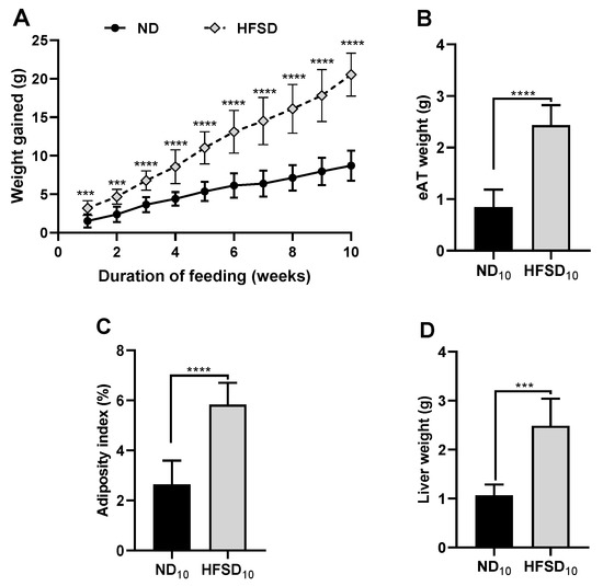 High-fat/sucrose diet feeding for 10 weeks causes significant adiposity and liver weight gain. (A) Cumulative weight change (B) Epididymal adipose tissue weight, (C) body adiposity index, and (D) liver weight in mice fed a normal diet or high-fat/sucrose diet (n ≥ 6 per group). Data expressed as means ± SD. ND10—10-week normal diet; HFSD10—10-week high-fat/sucrose diet; *** p ≤ 0.001, **** p ≤ 0.0001.