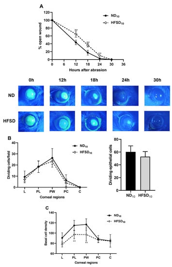 High-fat/sucrose diet feeding for 10 weeks impairs corneal wound healing. (A) Corneal wound closure in mice fed a normal or high-fat/sucrose diet. Top: Wound closure kinetics. Bottom: Representative images of the epithelial wound immediately after wounding, 12 h, 18 h, 24 h, and 30 h after wounding. (B) Left: Dividing basal epithelial cells in each region of the cornea. Right: Sum of dividing basal epithelial cells in four fields of view from the periphery to the center of the cornea & (C) Basal epithelial cell density in each region of the cornea at 30 h after wounding. Data expressed as mean ± S.D. ND10—10-week normal diet; HFSD10—10-week high-fat/sucrose diet; L—limbus; PL—paralimbus/periphery; PW—parawound; PC—paracentral; C—center; ** p ≤ 0.01.