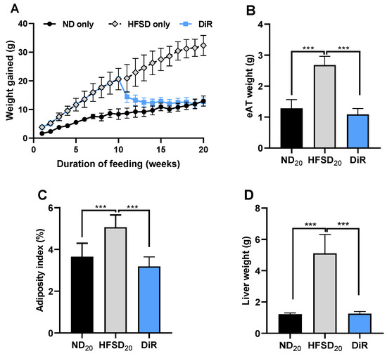 Diet reversal attenuates adiposity and liver weight gain. Mice were fed for a total of 20 weeks. (A) Cumulative weight change (B) Epididymal adipose tissue weight, (C) body adiposity index, and (D) liver weight in mice fed only the normal diet, only the high-fat/sucrose diet, and the diet reversal mice (n ≥ 7 per group). Data expressed as mean ± S.D. ND20—20-week normal diet; HFSD20—20-week high fat diet; DiR—diet reversal; *** p ≤ 0.001.
