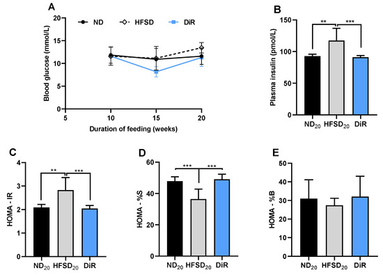 Diet reversal ameliorates dysregulated insulin sensitivity (A) Fasting blood glucose levels (n ≥ 7 per group). (B) Plasma insulin levels, (C) Insulin resistance, (D) Insulin sensitivity, and (E) Beta cell function in mice fed only the normal diet, only the high-fat/sucrose diet, and the diet reversal mice (n ≥ 7 per group). Data expressed as mean ± S.D. ND20—20-week normal diet; HFSD20—20-week high fat diet; DiR—diet reversal; ** p ≤ 0.01, *** p ≤ 0.001.