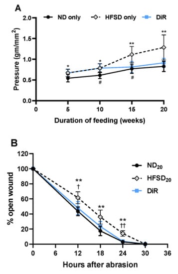 In the current study, we observed delayed wound closure in mice fed the high-fat sucrose diet, at both 10 and 20 weeks of experimental feeding; wound closure was delayed by approximately 6 h. We had previously reported similar findings of impaired corneal wound healing after 10 days of high-fat/sucrose diet [,]. Obesity induced impaired corneal wound healing has been reported by other authors. Kang et al. using a diet-induced obesity mouse model reported impaired corneal wound healing after 6 weeks of high-fat diet feeding []. Well-regulated extravasation of neutrophils and platelets at the corneal limbus and subsequent migration of neutrophils to the center of the cornea is vital for corneal wound closure and re-epithelialization following a corneal epithelial abrasion wound. Consistent with our earlier reports at 10 days of high-fat/sucrose diet [,], high-fat/sucrose diet feeding for 10 and 20 weeks caused a dysregulated neutrophil and platelet influx into the cornea. The number of extravasated platelets at the limbus and neutrophils at the center of the cornea was reduced when measured at 30 h post wounding. Reversing mice to the normal diet, which is low in fat and sugar, restored normal corneal wound closure and the normal influx of platelet at the limbus and migration of neutrophils to the center of the cornea.
