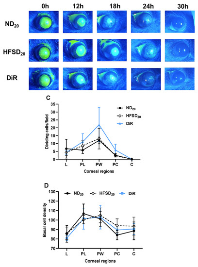 In mice fed the normal diet for 10 weeks, wound closure following a 2 mm corneal epithelial abrasion wound was completed 24 h after wounding. Wound closure in mice fed the high-fat/sucrose diet for 10 weeks was delayed by ~6 h (Figure 3A). At 30 h post wounding, the number of dividing epithelial cells across the different corneal regions did not differ between the two groups (Figure 3B). Basal epithelial cell density is a sensitive indicator of re-epithelialization [,]. In the peripheral and parawound regions, basal epithelial cell density was significantly reduced in mice fed the high-fat/sucrose diet at 30 h post wounding (Figure 3C).
