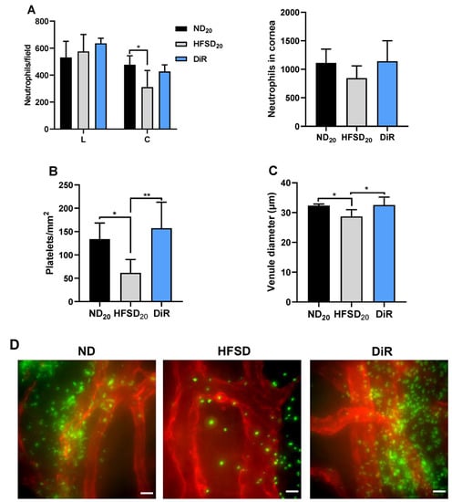 Diet reversal restored normal abrasion-induced inflammation. (A) Left: The distribution of neutrophils over the limbus and center of the cornea 30 h after wounding. Right: Sum of neutrophils in four fields of view of the cornea (periphery, parawound, paracentral and center) at 30 h after wounding. (B) Platelets count at the limbus 30 h after wounding. (C) Diameter of venules at the corneal limbus. (D) Representative images of platelets at the limbus; images captured with a 60X oil objective lens (scale bar = 15 µm). Data expressed as means ± SD; ND20—20-week normal diet; HFSD20—20-week high-fat/sucrose diet; DiR—diet reversal; L—limbus; C—center * p ≤ 0.05, ** p ≤ 0.01. Scale bars: D = 15 µm.
