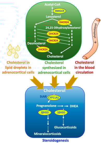 - Mason, J.I.; Rainey, W.E. Steroidogenesis in the human fetal adrenal: A role for cholesterol synthesized de novo. J. Clin. Endocrinol. Metab. 1987, 64, 140–147. [Google Scholar] [CrossRef] [PubMed]