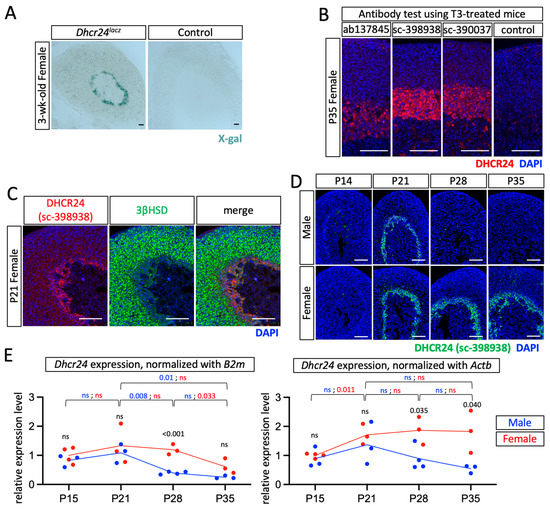 DHCR24 expression. (A) X-gal staining of tissues from 3-week-old female mice that were either heterozygous for Dhcr24lacz or the wild-type from the Dhcr24lacz strain. (B) Immunostaining of DHCR24 using three different commercially available antibodies. Mice were treated with T3 water for 10 days to increase the expression level of DHCR24. The negative control sample was stained using the same method except for incubating with the primary antibody. (C) Double immunostaining using DHCR24 antibody #sc-398938 and 3βHSD on euthyroid wild-type B6 mice. (D) Immunostaining using DHCR24 antibody #sc-398938 on euthyroid wild-type B6 mice. (E) Quantitative polymerase chain reaction was performed to detect the relative expression levels of Dhcr24, normalized with either B2m or Actb to P15 males (set as 1), in whole adrenal glands. p-values are shown for the comparison of the same sex between adjacent time points (font color red: female, font color blue: male), and the comparison of male vs. female within each time point (font color black). The trends are shown with the mean. Each data point contains pooled samples from at least three mice. The cell nuclei were counterstained with DAPI (blue). Scale bars, 130 µm. ns, no significant difference.