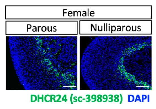 Immunostaining using DHCR24 antibody #sc-398938 of tissue from parous and nulliparous euthyroid wild-type B6 mice. The cell nuclei were counterstained with DAPI (blue). Scale bars, 130 µm.