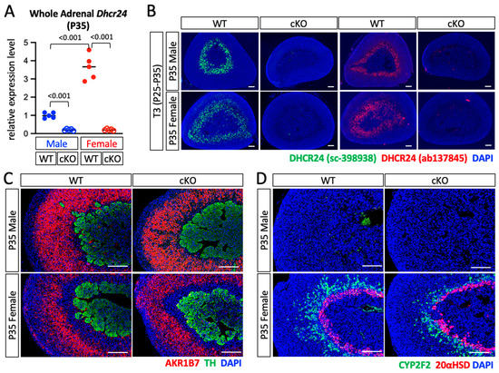 Phenotypic analyses of Dhcr24 cKO mice. (A) Quantitative polymerase chain reaction was performed to detect the relative expression levels of Dhcr24 in whole adrenal glands from cKO and WT littermates at P35. The relative expression levels of Dhcr24 in cKO mice were normalized to those of the male WT mice. Each dot (WT) and circle (cKO) represents data from one mouse. Data are shown with the mean. (B) Immunostaining using DHCR24 antibodies #sc-398938 and #ab137845. The mice were treated with T3 drinking water for 10 days to increase the expression level of DHCR24. The cell nuclei were counterstained with DAPI (blue). (C,D) Immunostaining showed areas of zona fasciculata (AKR1B7-positive), medulla (tyrosine hydroxylase (TH)-positive), and inner cortex (CYP2F2- or 20αHSD-positive) in euthyroid P35 mice. The cell nuclei were counterstained with DAPI (blue). WT: wild-type mice, cKO: Dhcr24 conditional knockout mice. Scale bars, 130 µm.