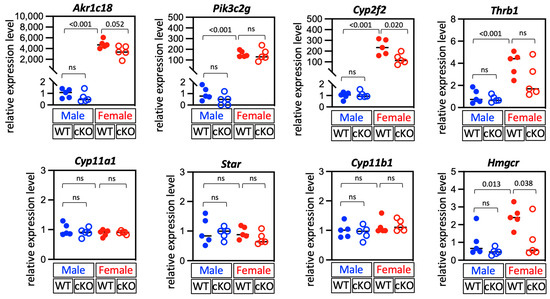 Quantitative polymerase chain reaction showed the relative expressions of key marker genes in the adrenal cortex. The relative expression levels of each gene in cKO mice were normalized to those of the male WT mice. Each dot (WT) and circle (cKO) represents data from one mouse. Data are shown with the mean. WT: wild-type mice, cKO: Dhcr24 conditional knockout mice. ns, no significant difference.