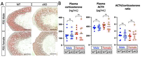 Because Dhcr24 is highly expressed in the inner cortex even under euthyroid conditions, it is also possible that DHCR24 confers cell protective effects under euthyroid conditions [27]. Although no significant difference was noticed in Dhcr24 cKO mice at P35 in both sexes (Figure 6), we are currently examining some earlier developmental stages to determine if deletion of DHCR24 leads to early regression of the X-zone in euthyroid mice. For example, compared with wild-type mice at the same age who usually retain a thin X-zone, male Dhcr24 cKO mice may lose all 20αHSD-positive cells at P28 [18]. A time-course analysis will show whether or not Dhcr24 has a role in controlling the normal regression process of the X-zone under euthyroid conditions.