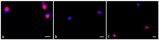 Acrosome integrity was detected in 100 spermatozoa. Fluorescent acrosome labeling defined three patterns, including intact (in the apical portion of the sperm head, Figure 1a), reduced (acrosome partially labeled, Figure 1b,c), and absent (completely reacted, Figure 1b,c).