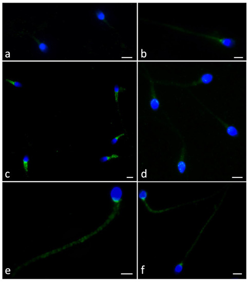 UV micrographs of swim-up selected sperm treated with anti-ryanodine antibody. The percentage of localization differed in control samples or those incubated with F4-NeuroPs for 2 or 4 h. In the controls, a high percentage of sperm showed diffuse and fair labeling (a) or a spot localized in the centriolar region (b). Sperm incubated for 2 h with F4-NeuroPs showed strong signals in the midpiece and postacrosomal sheath (c,d). After 4 h F4-NeuroP incubation, the labeling appeared dotted along the total tail (e,f). Nuclei (blue) were stained with DAPI. Figure 2 without DAPI was included in Supplementary Materials. Bars: 6 μM.
