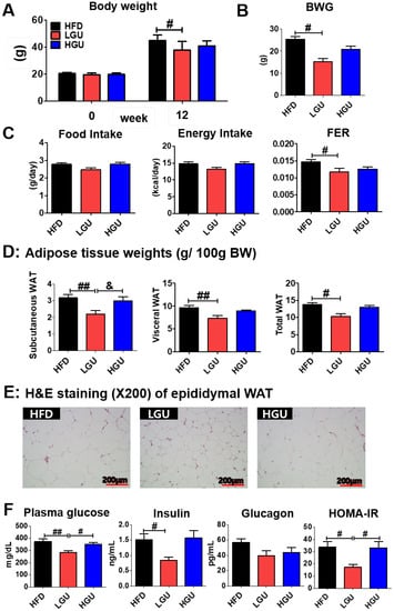 Effects of low-dose G. uralensis Fischer extract supplementation on diet-induced obesity with respect to body weight (A); body weight gain (B); food intake, energy intake, and food efficiency ratio (C); adipose tissue weight (D); epididymal white adipose tissue morphology (200× magnification) (E); and levels of plasma glucose, insulin, glucagon, and HOMA-IR (F). Data are presented as the mean ± SEM. Significant differences among the high-fat diet groups are indicated: # p < 0.05, ## p < 0.01. Significant differences between LGU and HGU are indicated: & p < 0.05. HFD, high-fat diet (60 kcal% fat); LGU, HFD + 0.015% G. uralensis Fischer; HGU, HFD + 0.03% G. uralensis Fischer.