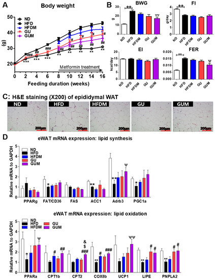 Effect of metformin, G. uralensis Fischer, and their combination after 16 weeks on body weight (A); body weight gain, food intake, energy intake, and food efficiency ratio (B); adipose tissue morphology (magnification 200×) (C); and epididymal WAT (eWAT) lipid-regulating gene expression (D) in C57BL/6J mice fed a high-fat diet (HFD). Data are presented as the mean ± SEM. Significant differences between HFD and ND are indicated: * p < 0.5, ** p < 0.01, *** p < 0.01. Significant differences among the high-fat diet groups are indicated: # p < 0.05, ## p < 0.01, ### p < 0.001. Significant differences between GUM and HFDM are indicated: $ p < 0.05. Significant differences between GUM and GU are indicated: & p < 0.05. When compared one-to-one, there were significant differences between GUM and HFD groups (Ψ p < 0.05, ΨΨ p < 0.01). ND, normal diet (AIN-93G 16 kcal% fat); HFD, high-fat diet (60 kcal% fat); HFDM, HFD + 50 mg/kg metformin; GU, HFD + 0.015% G. uralensis Fischer 0.015%; GUM, HFD + 0.015% G. uralensis Fischer + 50 mg/kg metformin.