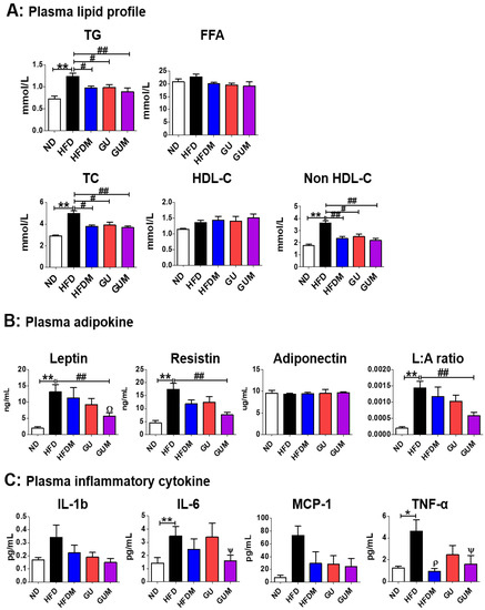 The levels of plasma TG, TC, and non-HDL-C in HFDM, GU, and GUM groups were significantly lower than those in the HFD group (Figure 3A). No significant difference was observed in plasma adiponectin levels among the HFD groups, whereas plasma leptin and resistin levels and the L:A ratio significantly decreased in the GUM group compared to those in the HFD group (Figure 3B). In addition, a comparison between GUM and HFDM groups showed that GUM supplementation significantly decreased plasma leptin levels. The levels of pro-inflammatory cytokines were significantly suppressed by metformin treatment (Figure 3C). The HFDM group showed significantly decreased plasma tumor necrosis factor-α (TNF-α) levels, whereas the GUM group showed significantly decreased interleukin-6 (IL-6) and TNF-α levels.