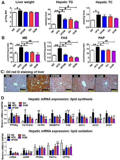 The liver weights did not differ significantly among the HFD groups, whereas the HFDM, GU, and GUM groups showed significantly decreased hepatic TG levels as compared to those in the HFD group (Figure 4A). In addition, the activities of hepatic lipogenic enzymes, including malic enzyme (ME), fatty acid synthase (FAS), and phosphatidate phosphohydrolase (PAP), were significantly decreased by HFDM, GU, and GUM supplementation (Figure 4B). Hepatic morphological observations and oil red O staining revealed lesser lipid formation and accumulation in the HFDM, GU, and GUM groups than those in the HFD group (Figure 4C). In the liver, the expression of lipid metabolism-related genes was regulated by HFDM, GU, and GUM supplementation (Figure 4D). The HFDM and GU groups showed a significantly downregulated expression of ADRP compared to the HFD group. The GUM group, a synergistic action group, showed significantly downregulated expression of Fatp4, Srebp1c, Fas, Scd1, Acc2, and Adrp, but significantly upregulated expression of Pgc1α, compared to the HFD group. Moreover, comparison between the GUM and HFDM groups showed that GUM supplementation significantly downregulated the expression of Srebp1c, Fas, and Acc2 but significantly upregulated the expression of Pgc1α.