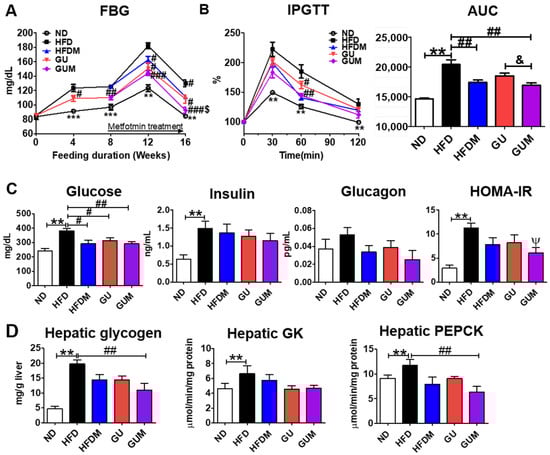 Effect of metformin, G. uralensis Fischer, and their combination after 16 weeks on fasting blood glucose (A); IPGTT and AUC (B); plasma glucose, insulin, and glucagon levels and HOMA-IR (C); and hepatic glycogen content and glucose-regulating enzyme activities (D) in C57BL/6J mice fed a high-fat diet. Data are presented as the mean ± SEM. Significant differences between HFD and ND are indicated: ** p < 0.01, *** p < 0.001. When compared one-to-one, there were significant differences between GUM and HFD: Ψ p < 0.05. Significant differences among the high-fat diet-fed groups are indicated: # p < 0.05, ## p < 0.01, ### p < 0.001. Significant differences between GUM and GU are indicated: & p < 0.05. ND, normal diet (AIN-93G 16 kcal% fat); HFD, high-fat diet (60 kcal% fat); HFDM, HFD + metformin 50 mg/kg; GU (G. uralensis Fischer), HFD + GU 0.015%; GUM, HFD + GU 0.015% + metformin 50 mg/kg. HOMA-IR = (fasting glucose (mmol/L) × fasting insulin (µIU/mL))/22.5.