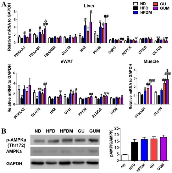 In the liver, epididymal WAT (eWAT), and muscle, the expression levels of the glucose metabolism-related genes were regulated by HFDM, GU, and GUM supplementation (Figure 6A). The HFDM group showed significantly upregulated hepatic Prkaa2, Prkab1, Hk2, and Pdhb; eWAT Prkab1; and muscle Pprkab1 and Glut4 expression compared to the HFD group. However, the GU group showed significantly upregulated hepatic Pdhb; eWAT Prkab1 and Glut4; and muscle Glut4 and Gpi1 expression. The GUM group, the synergistic action group, showed significantly upregulated hepatic Prkaa2, Prkab1, Hk2, and Pdhb; eWAT Prkab1 and glut4; and muscle glut4, Hk2, Gpi1, Pkm2, and Aldoa expression compared to the HFD group, while it showed significantly downregulated hepatic G6pc, Pepck, and Crtc2 expression. Consistent with these results, the protein expression of phospho-AMPKa, which is the activated form of the AMPK, in HFDM and GU groups was higher than the HFD group in hepatic tissue (Figure 6B). Moreover, the GUM group had the highest protein expression of phosphor-AMPKa (Thr172).
