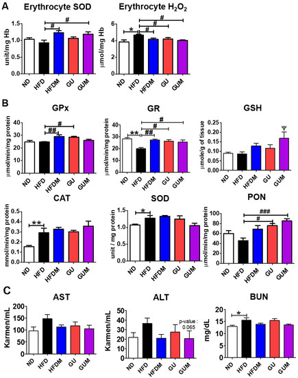 The activities of the erythrocyte antioxidant enzyme SOD were significantly increased in the metformin-treated groups compared to those in the HFD group, and the H2O2 lipotoxicity marker level was significantly decreased in the HFDM, GU, and GUM groups (Figure 7A). In addition, the HFDM, GU, and GUM groups showed significantly increased glutathione reductase (GR) activity compared to that in the HFD group. The HFDM and GU groups showed significantly increased glutathione peroxidase (GPx) activity, and the GU and GUM groups showed significantly increased paraoxonase (PON) activity (Figure 7B). Additionally, glutathione (GSH) levels were significantly higher in the GUM group than in the HFD group. The levels of aspartate aminotransferase (AST) and alanine aminotransferase (ALT), which are indicators of hepatotoxicity, and blood urea nitrogen (BUN), which is a renal function index, showed no significant differences among the HFD groups (Figure 7C).